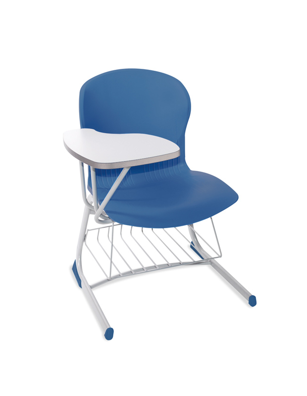 • Pupitre Capri de polipropileno color azul con base de trineo y regatones y terminación color gris, incluida canastilla y paleta cubierta de LPAP.