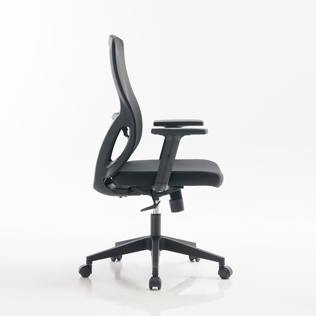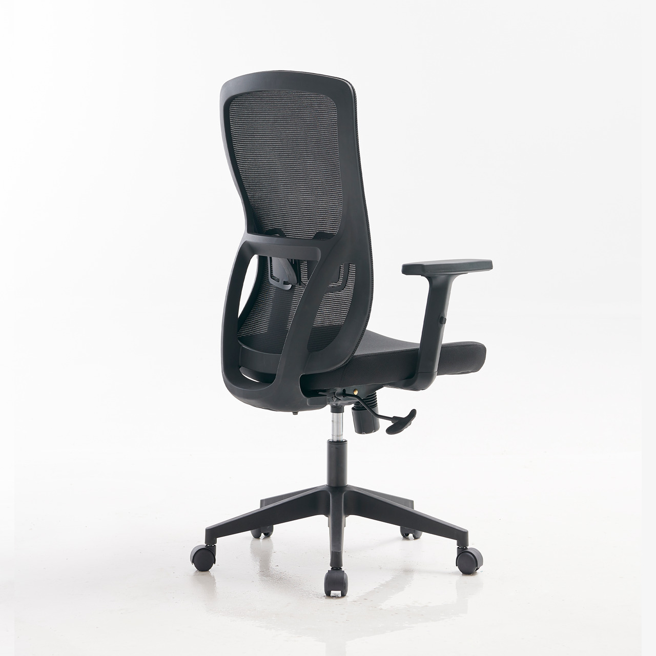 RESPALDO: Marco de polipropileno con brazos de soporte tapizado en malla color negro, cuenta con nervaduras en la parte inferior para mayor resistencia, a la mitad del marco cuenta con soporte lumbar fabricado en polipropileno con ajuste de altura, acabado en color negro.