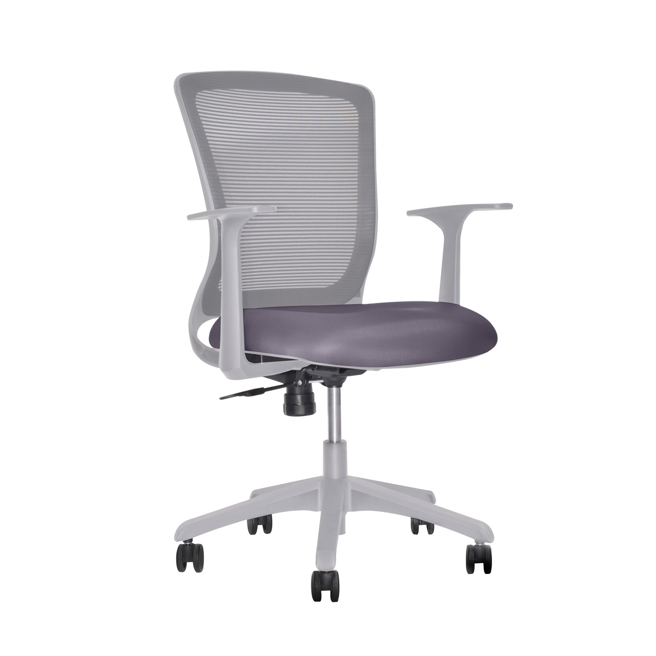 ASIENTO: Acojinamiento a base de espuma laminada de poliuretano, tapizado en tela 100% de poliéster, concha en polipropileno color gris.