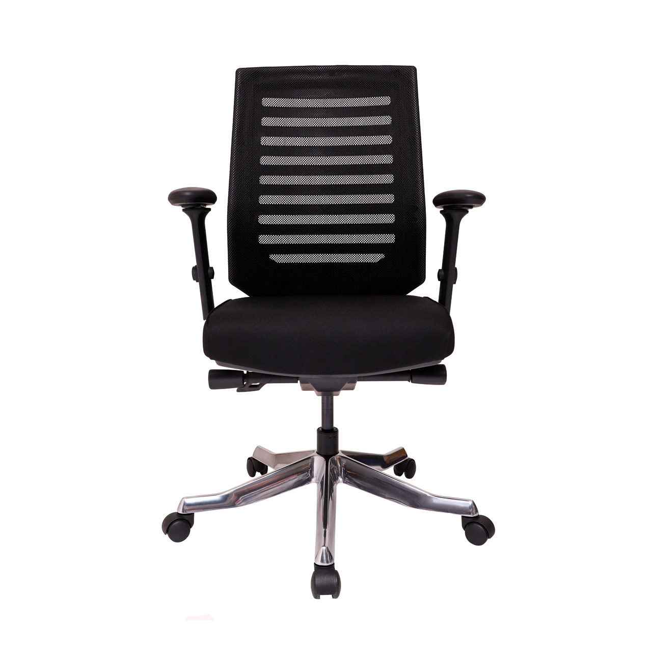 RESPALDO: Marco blanco de polipropileno con soporte de unión en forma de “Y” en aluminio fi­jo por tornillos, unido al mecanismo por medio de tornillos, respaldo tapizado en malla 100% poliéster color gris, con soporte lumbar integrado.