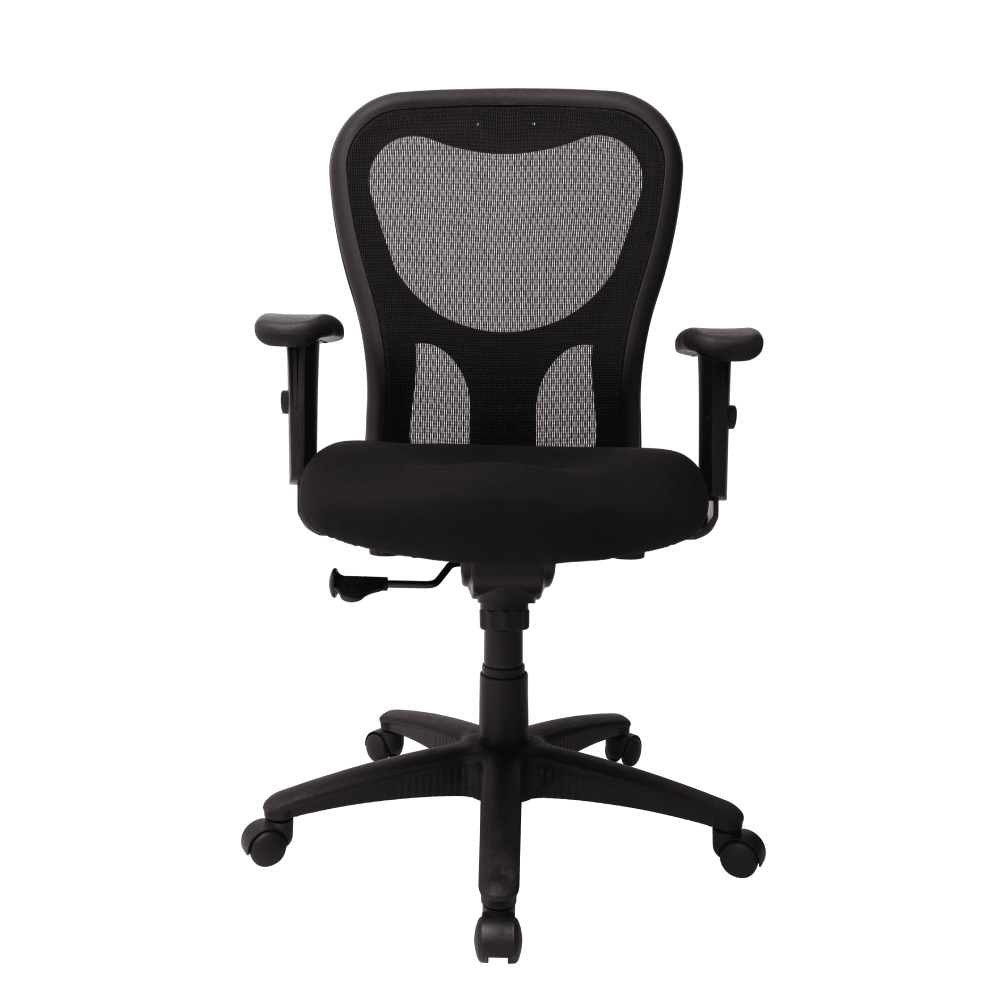 RESPALDO: Marco de polipropileno tapizado en malla 100% poliéster, unido con brazos de soporte en una pieza en forma de “Y” en color negro con soporte lumbar integrado, tapones plásticos decorativos para ocultar tornillería de tensión de la malla y para ocultar perforaciones para la fijación de cabecera.