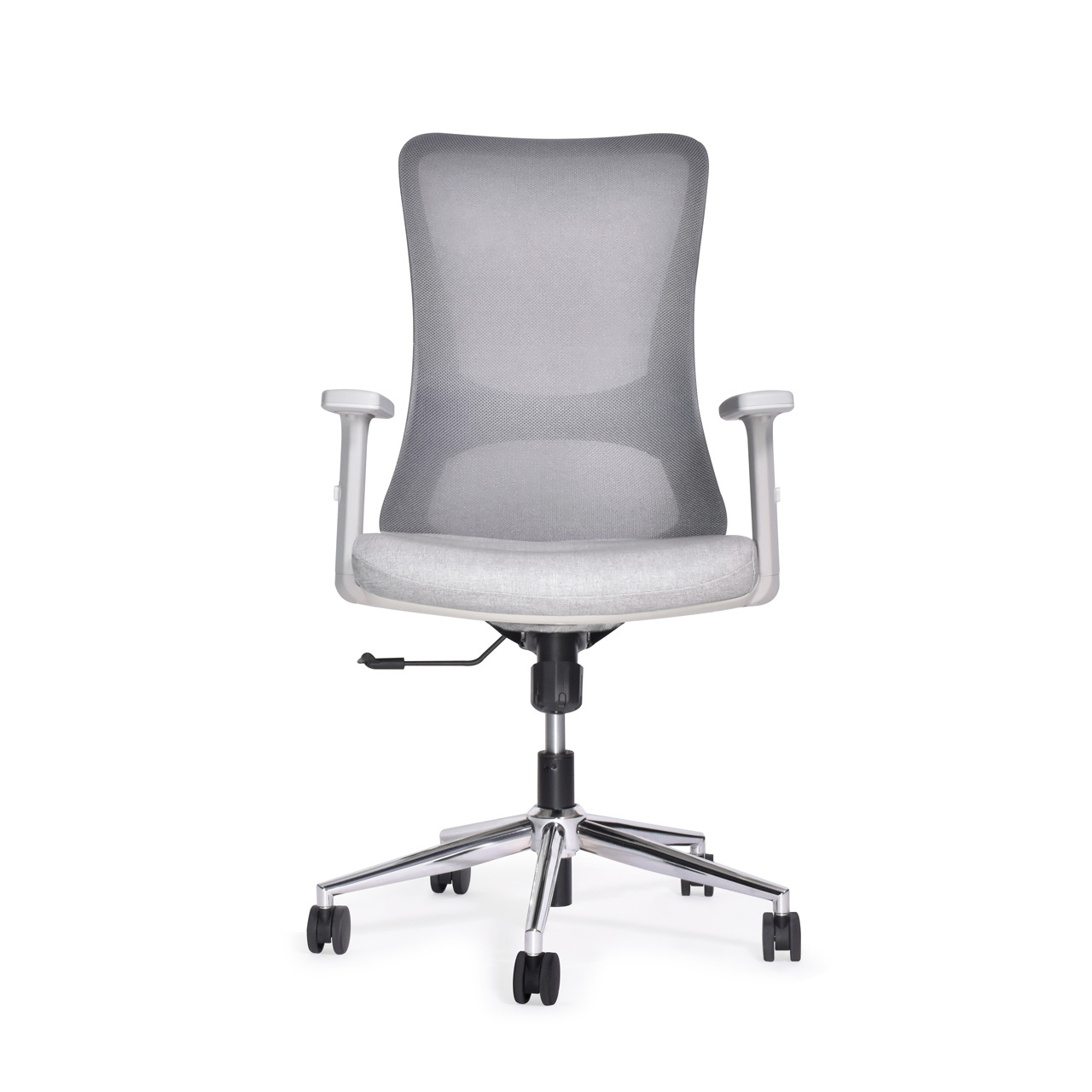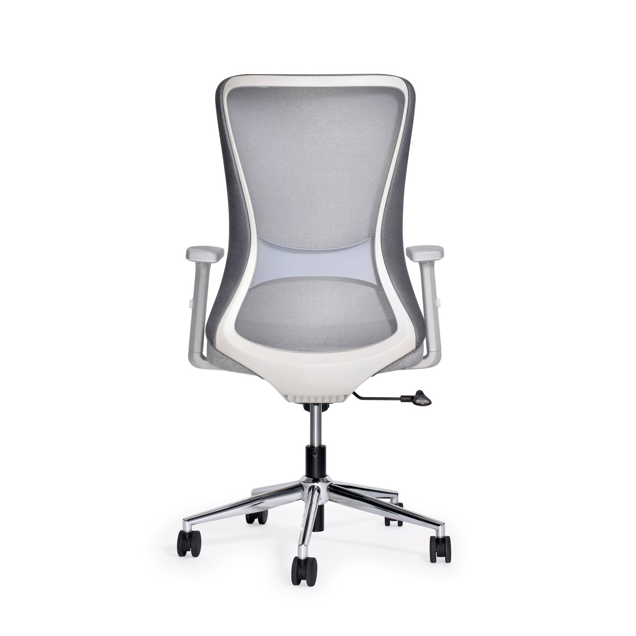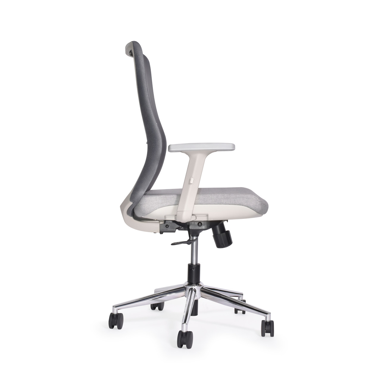 RESPALDO: Marco de polipropileno color blanco antiguo, tapizado en malla 100% poliéster en color gris unido al marco en cada extremo el soporte lumbar ajustable en color gris, fabricado en polipropileno en color negro.