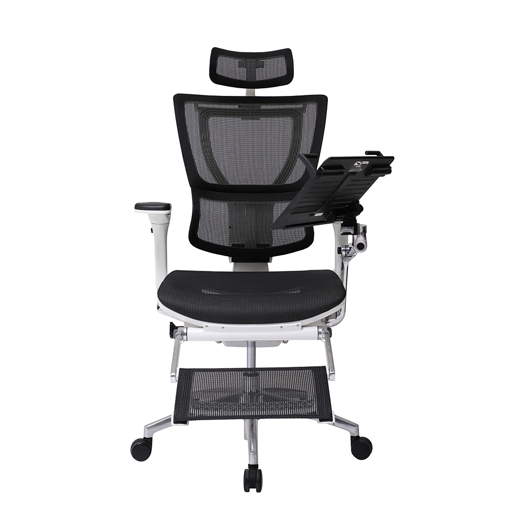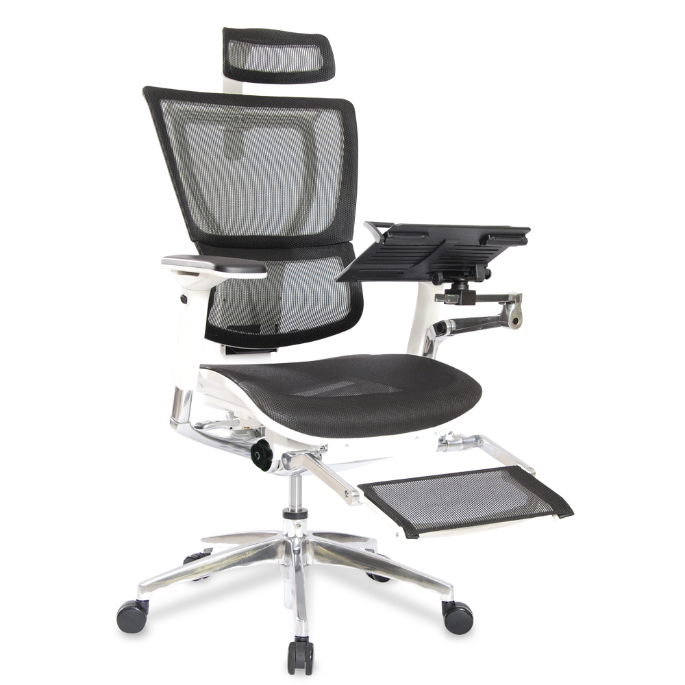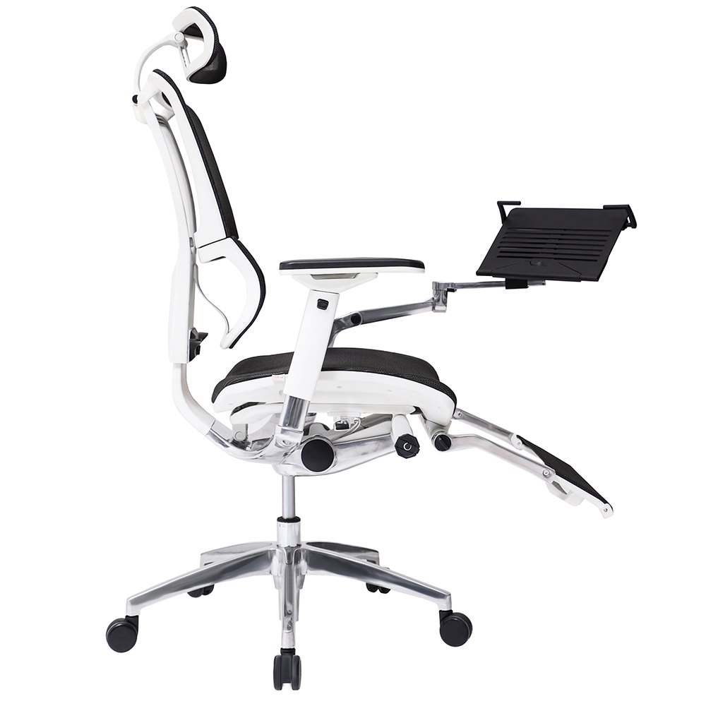 RODAJAS Y BASE: Rodajas duales tipo yoyo para piso duro y alfombra, fabricada en polipropileno de alto impacto, arandelas metálicas que eviten el desprendimiento. Su base es una cruceta de 5 puntas fabricada en aluminio pulido con nervaduras de refuerzo por punta. SISTEMA DE ELEVACION Y MECANISMO: Su sistema es un mecanismo Synchro con control de palanca y reclinamiento con bloqueo de 4 posiciones. Su sistema es un pistón neumático de alta presión de gas con capacidad de 60,000. ASIENTO Y RESPALDO: Asiento y Respaldo argómico tapizado en malla 100% de poliéster. Respaldo con marco de polipropileno en 2 piezas, con un ajuste de altura de 3 posiciones por medio de cremallera. Asiento con caída de cascada en la parte frontal, así como aplicaciones de espuma de poliuretano en zona frontal. DESCANSA BRAZOS: Tipo “T”, brazos 4D, ajuste de altura en 8 posiciones, ángulo y profundidad, ajuste lateral 3 posiciones, fabricados en polipropileno y aluminio de primera calidad. CABECERA: Fabricada en marco de polipropileno de alta calidad, ajuste en altura y ángulo de inclinación en 2 posiciones accionado con botón lateral. Unido al marco del soporte del respaldo en forma de “Y” con tornillos, tapizada en malla 100% poliéster POSA-PIES: Fijo al asiento por estructura en aluminio terminado en color blanco, tapizado en malla 100% poliéster, montadas a un marco estructural de polipropileno y aluminio pulido, unido al asiento con tornillos. PORTA LAPTOP: Fijo al mecanismo por medido de brazo articulado fraccionado en tres secciones fabricado en aluminio Pulido.